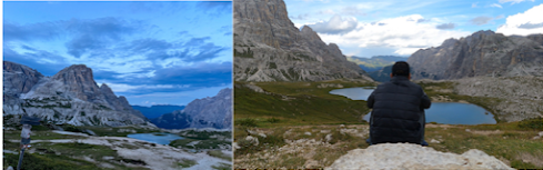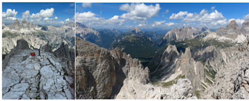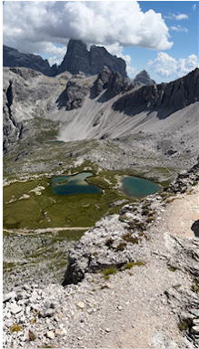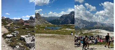 When I finally topped the horizon, I was greeted by my destination hut; Rifugio Locatelli (Above left photo). To the West sat the pillars, only slightly larger than they were before. I wasn’t headed towards those after all. I was told that Rifugio Locatelli is one of the busiest huts in the Dolomites. Of that I have no doubt. Its home was a picturesque plateau with a 360 view of Dolomite wonder. The back yard was a set of pristine lakes, the very definition of serenity (Above middle photo). People sat around on the hills surrounding the lakes, taking in the scene. The front of the hut displayed a large outdoor eating area. It was filled with hungry hikers eating a late lunch and enjoying a beer or two. Beyond the tables was an expanse of flat rocks that overlooked the surrounding area (Above right photo). People congregated on these rocks to take in the views. This is why love these mountains. This is why I love the Alta Via experience. This was everything to me.