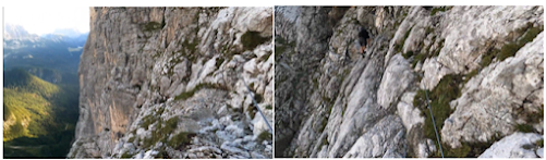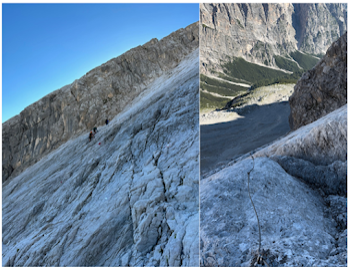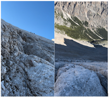 Another hour and I was at the top of a plateau overlooking the valley. I had come a long way. In front of me a giant mountain loomed rising up what seemed like 10,000 FT. That was the Antelao Glacier and that is where I was going. Here started my final long via ferrata section aptly name the “Via Ferrata of the Antelao Glacier.” This too had a rating of 3B. I could see 4 guys about halfway up this via ferrata. They looked like tiny dots moving across a huge mountain (below left picture).