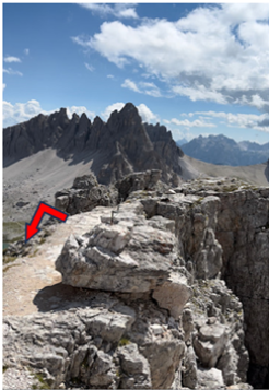 I was not done for the day. Part of the AV4 adventure was the Via Ferrata options. Today I had the choice between two that were close to the hut. I chose to tackle Via Ferrata Torre di Toblin. The via ferrata was rated a 3B, which basically meant I was probably in over my head. I dropped my pack at the hut, grabbed my gear and my day bag and headed up to the start of the Via Ferrata Torre di Toblin. The peak I was climbing was very close to the hut and it took me less than 20 minutes to get to the start (Above photo). As I was putting my gear on a young couple walked up behind me. They had look of uncertainty on their faces. I knew that look because I had it. I asked them if this was their first time. They said “Yes.” I said, “Me too.” That seemed to make them feel better. Unfortunately, it didn’t do a lot for me. I was the one going first. I turned around, clipped my carabiners to the iron cable, took a deep breath and started my first via ferrata. To say this was a new experience for me was a vast understatement. I didn’t “practice,” how could I? I had been on ladders and used the cables before on my treks in Italy, but never for a sustained period of time and never with a degree of difficulty I was about to encounter.
