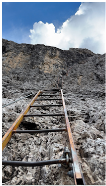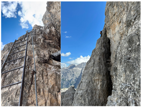 I felt comforted by the fact that two people were in front of me and countless people were behind me. At least I knew I was in the right place. I put on my harness and started what would be the most memorable via ferrata experience of the trip. As I started my ascent up the first set of ladders, I tried to comprehend what I was about to climb. The fact that there was some sort of path up and along this mountain wall was something out of a fairytale. It did not seem as if there should be a trail here, but there was.