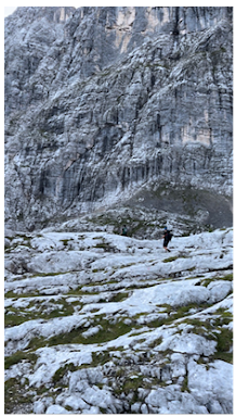 I had a quick lunch, ditched my bag and started my trek to the start of the via ferrata. The path seemed to be straight up. As I went further and further the hut got smaller and smaller behind me (Above left photo). It was comforting to see the hut as I continued on. It was a beacon of safety in case something went wrong. When I finally got to the start of the via ferrata I looked up.
