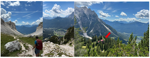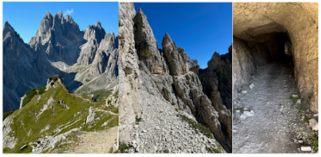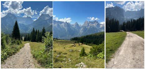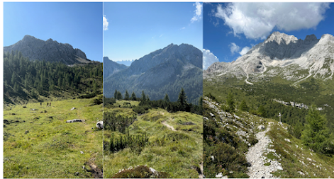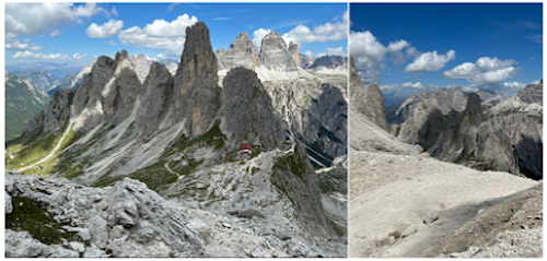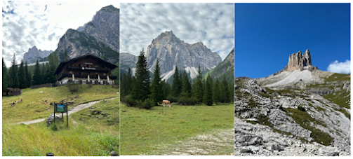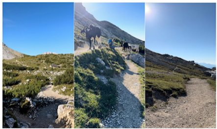 It was an uneventful hike for a few hours. An old rocky road weaved its way up through the uneven landscape. This is where the anticipation starts to grow. What will I see next? What awaits me at the end of this day? Eventually I came to the first hut on the AV4 route, Rifugio Tre Scarperi (above left photo). I know people stay here, but for me it didn’t make much sense. We are still way too close to the start. Better to venture further. The path heads through a meadow where cows are grazing (above middle photo). Here, the first bells of the trip, a welcome sound to my ears. It is so distinctly Dolomites. I love it. From here the path bends slightly to the West and begins the first real ascent of the day. The further up I climbed, the more I was swallowed up by the vastness of these mountains. I thoroughly enjoyed this section. I was alone. I had only seen a couple of people so far. Three giant pillars sat perched up the horizon (Above right photo). They could have been a mile or 100 miles away. It was impossible to tell. Was I headed towards them? I continued on eager to find out.