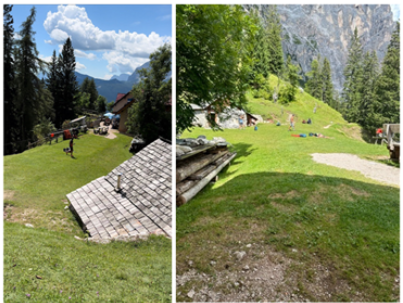 We reached the pass and the path headed down a steep narrow path. In the distance we could see the hut. There it was, perched on a cliff with the village of San Vito di Cadore below it (Above middle picture). The sight was something to behold. I was so happy when we arrived. The hut was located on a large grassy plateau (below photos). There were a lot of day hikers lying in the sun and relaxing. What an amazing place. We completed the most difficult section of the AV4 in record time. The next group wouldn’t get there for 3 more hours. We sat down and had some lunch. Gareth continued to talk my ear off during lunch. I was ready for a nap. Gareth took off for the next hut and I lied on the grass awaiting the next groups to complete their day 4 treks.