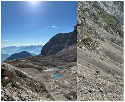 After an unknown amount of time, I reached the peak and in doing so entered yet another alien landscape. To my right was clearly the glacier. The unique shape of the mountainside funneling down into the valley was unmistakable. At the bottom was two tiny lakes. They couldn’t be real lakes. “Pools” was a better description (Above left photo). The water looked even more alien than the landscape. I took a few photos and started my descent. The remainder of my time on the AV4 would be sent descending down and back towards civilization. There was a sadness in that. A finality, like reading the last chapter of the book and knowing there were a finite number of pages left. How would the story end? What awaited me in this final chapter? Only one way to find out. The more I descended the more the landscape changed. From stark brown to bright green and every shade in between. I was exhausted. I encountered a group of Austrian Ibex (Above right photo). Their horns were distinct and unmistakable. There were about 10 of them. Some where standing around, some lying down. They didn’t seem to be too scared of people. They were pretty close to the path. Maybe 20 feet or so. It was difficult to take my eyes off of them as I walked by. The path was on a relatively steep decline with plenty of loose rocks. When your legs are tired, it’s easy to lose balance. This was particularly true when your focus was on these animals. I fell not once, but twice. I decided it was a good time to take a break. I sat on the path and ate an apple while the animals continued to ignore me. I was in their domain. These things could run up, down and along the sides of cliffs with an effortless grace. I was no threat to them.