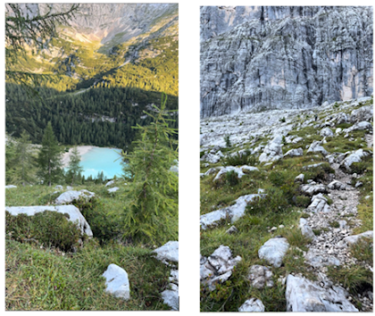I started the day feeling sluggish, but I barely realized it as I hiked out of the plateau leaving Lake Sorapiss behind. Soon I was surrounded by an unexplainable terrain that was filled with rock cropping’s and lush green fauna. An odd combination for sure, but it worked. It was yet another landscape type to be enjoyed in the Dolomites. In the distance I could see the trail zig zag its way up before converging with the face of a giant mountain (Above right photo). I could only imagine where the trail went after that. It was still a ways a way, but it made me wonder what I had gotten myself into on this Day 4 hike.